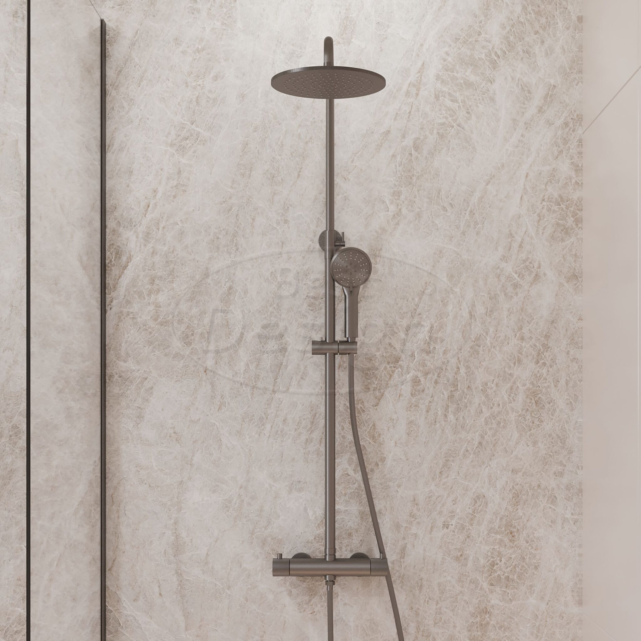 De High-End Moya regendouche-opbouwset uit de High-End collectie is ontworpen voor wie luxe en comfort wil combineren. De set is vervaardigd uit RVS en uitgevoerd in een stoere gunmetal kleur die een moderne, krachtige uitstraling in de badkamer creëert. De hoofddouche en thermostaatknoppen zijn voorzien van een stijlvol geribbeld reliëf dat de afwerking extra karakter geeft. De handdouche beschikt over drie standen, zodat je moeiteloos wisselt tussen verschillende straalsoorten voor een optimale douche-ervaring.