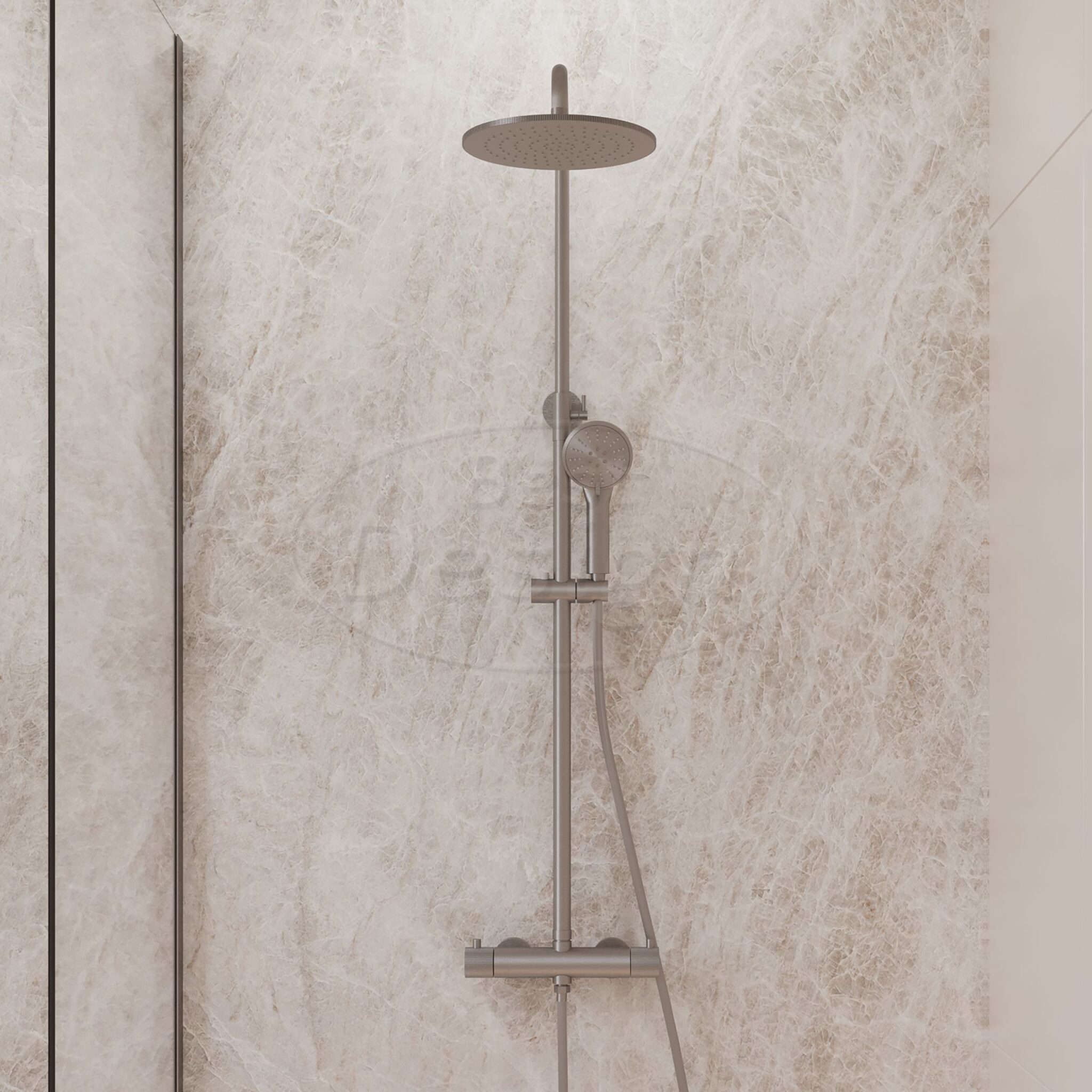 De High-End Ore regendouche-opbouwset uit de High-End collectie is ontworpen voor wie luxe en comfort wil combineren. De set is vervaardigd uit RVS en uitgevoerd in een tijdloze RVS-kleur die de badkamer een strakke, frisse en moderne uitstraling geeft. De hoofddouche en thermostaatknoppen zijn voorzien van een stijlvol geribbeld reliƫf dat de afwerking extra karakter geeft. De handdouche beschikt over drie standen, zodat je moeiteloos wisselt tussen verschillende straalsoorten voor een optimale douche-ervaring.
