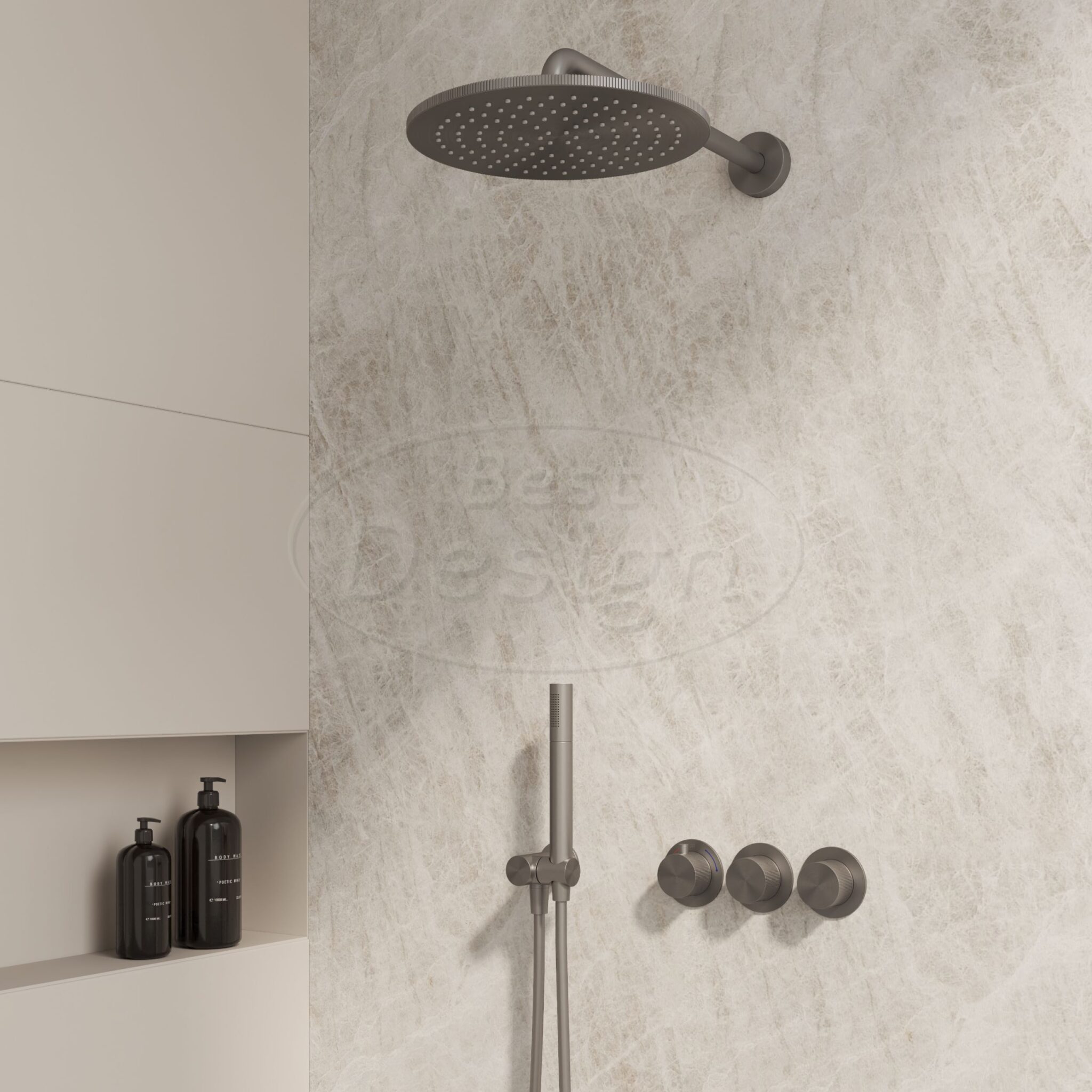 De High-End Moya M-250 inbouw-regendoucheset heeft een karaktervolle uitstraling dankzij de gunmetal afwerking en gemaakt van RVS. Deze kleur brengt een subtiel industriële, maar toch verfijnde sfeer in de badkamer. Zowel de hoofddouche als de bedieningsknoppen van de inbouwthermostaat zijn uitgerust met een elegant geribbeld reliëf.