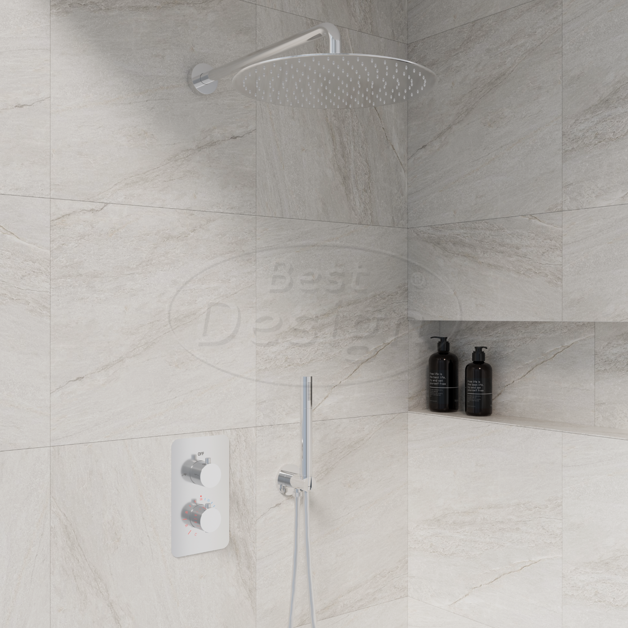 Deze one-pack inbouw-regendoucheset “Verona-M-300” bevat alles wat je nodig hebt voor een luxueuze douche-ervaring. De set bestaat uit de inbouwthermostaat (4004680), opsteekmuuraansluiting (3860830), handdouche (3871114), doucheslang (3801110), muurbeugel (4015980) en de regendouche (3801292). Met de inbouwinstallatie krijgt je badkamer een strakke en elegante look. Kies jij voor de verfrissende regendouche of gebruik je de handdouche voor ultiem comfort?