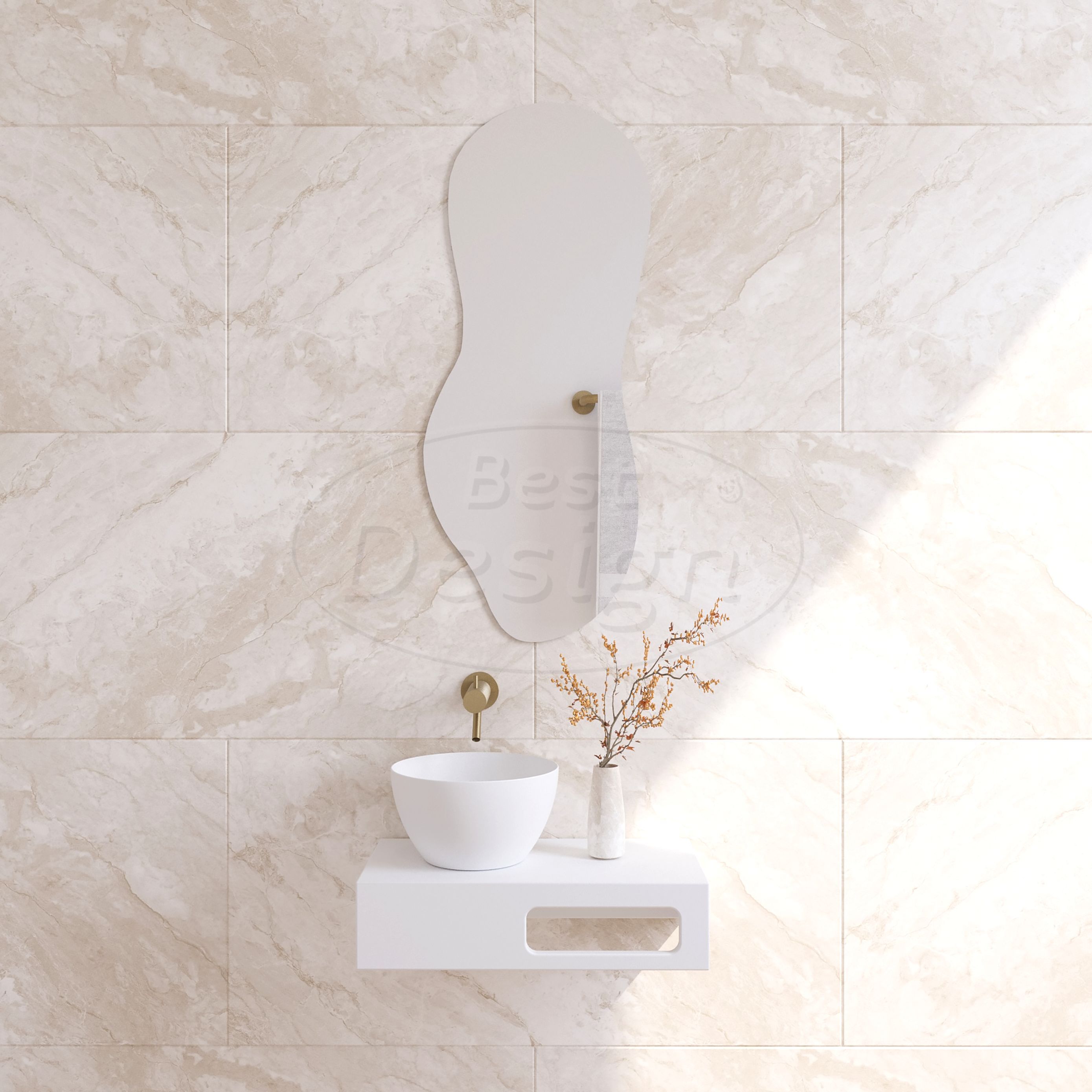 De “Oslo” spiegel is een stijlvolle keuze voor kleinere ruimtes zoals het toilet of de hal. Dankzij de organische vorm en het compacte formaat van 30×70 cm past hij gemakkelijk op smalle wanden. Het randloze ontwerp geeft de spiegel een rustige, verfijnde uitstraling en laat zich eenvoudig combineren met verschillende interieurstijlen. Door zijn lichte en slanke ontwerp is de “Oslo” eenvoudig op te hangen en flexibel in gebruik. Een subtiele, maar doordachte toevoeging voor wie houdt van eenvoud met een helder effect.